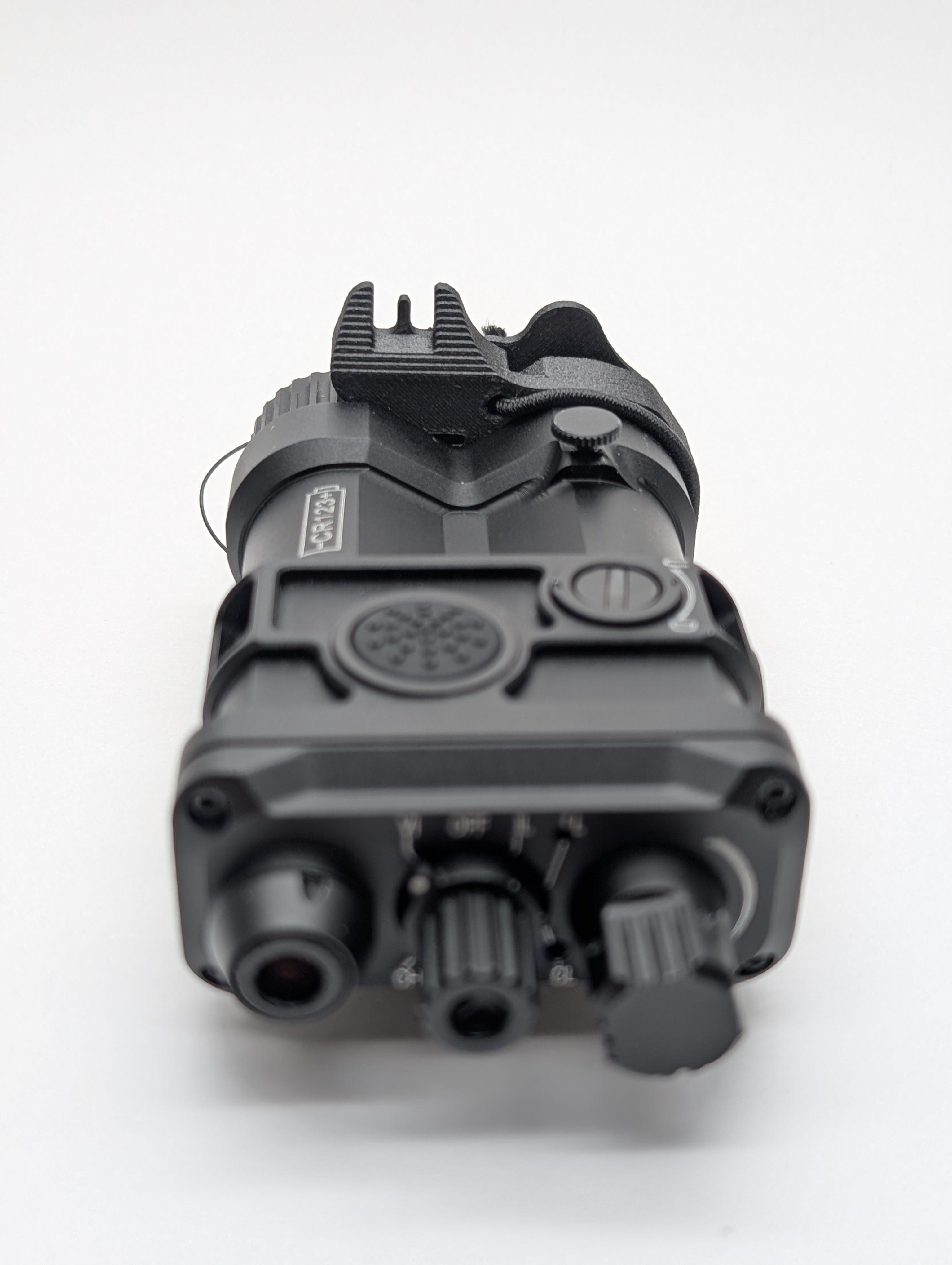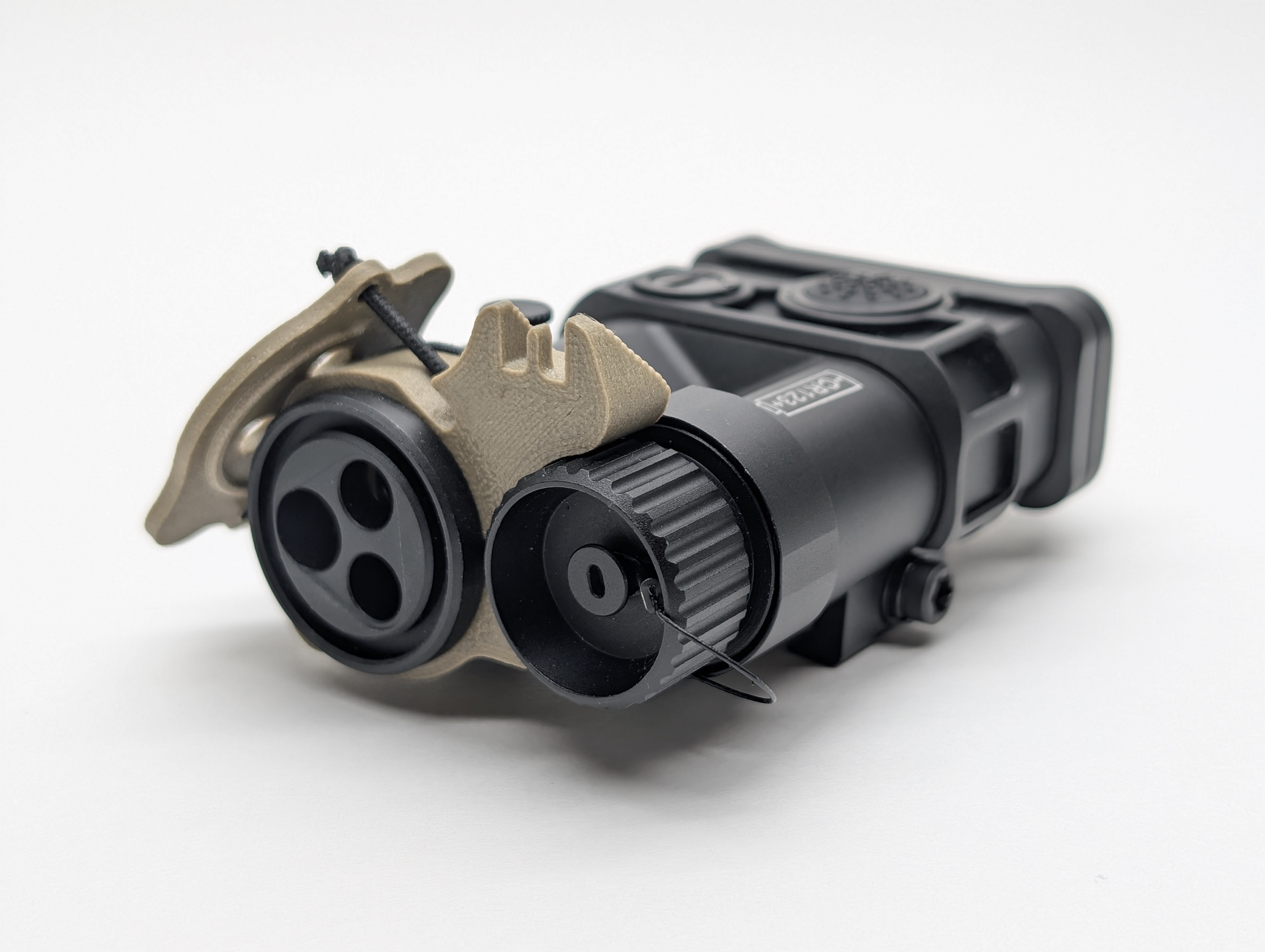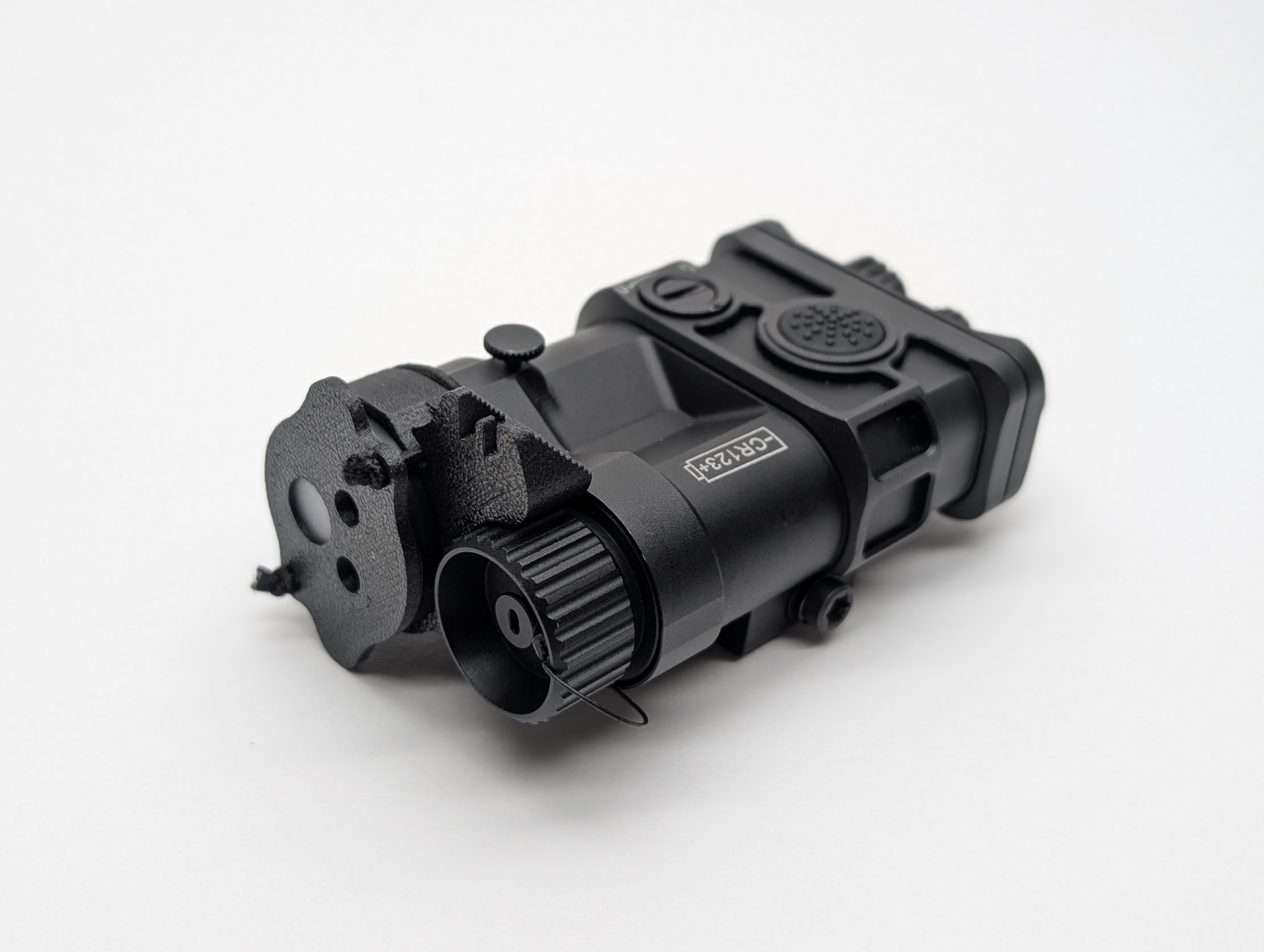 Additionally, this device includes an IR Illuminator diffusion cap. The diffusion cap increases the usefulness of the IR illuminator in short range and indoor scenarios by spreading out the IR light from a tight spotlight into a broad floodlight. This allows the IR laser to be more easily identifiable, increases field of view by illuminating a wider area, and decreases autogating on your night vision unit. The diffusion cap is designed with a quick deploy mechanism for placing it in front of the illuminator, and has easy to grip tabs for resetting the position.