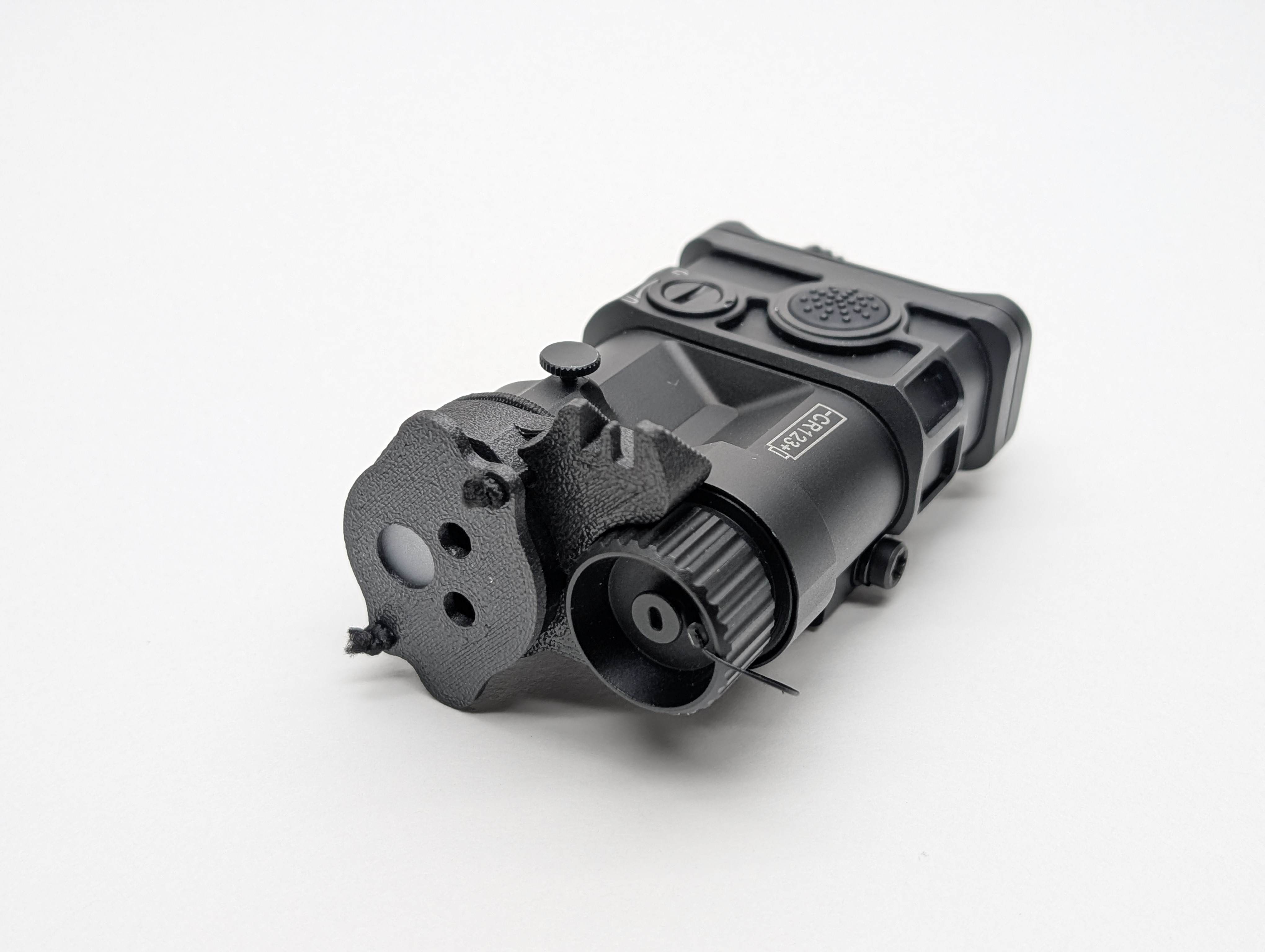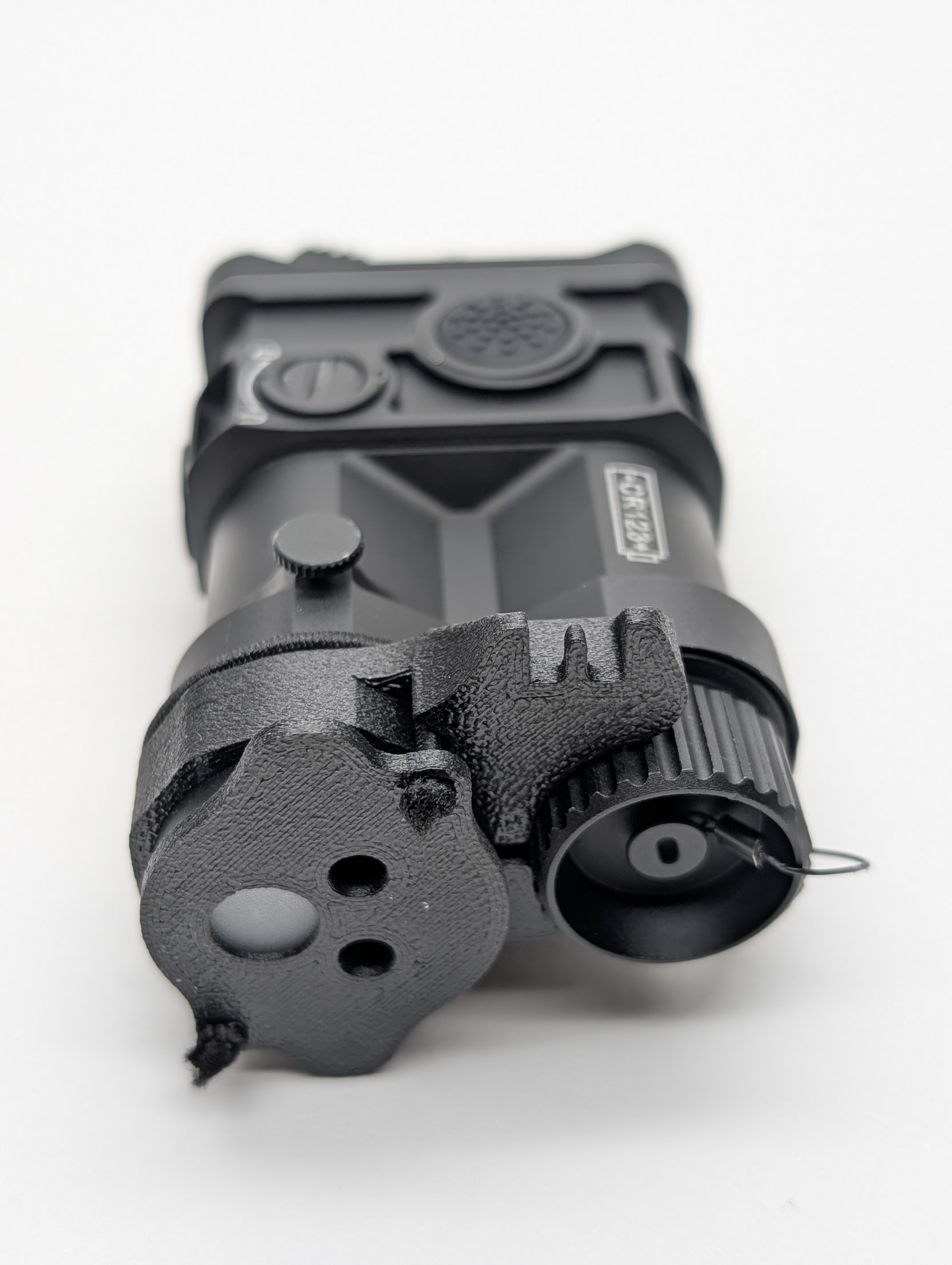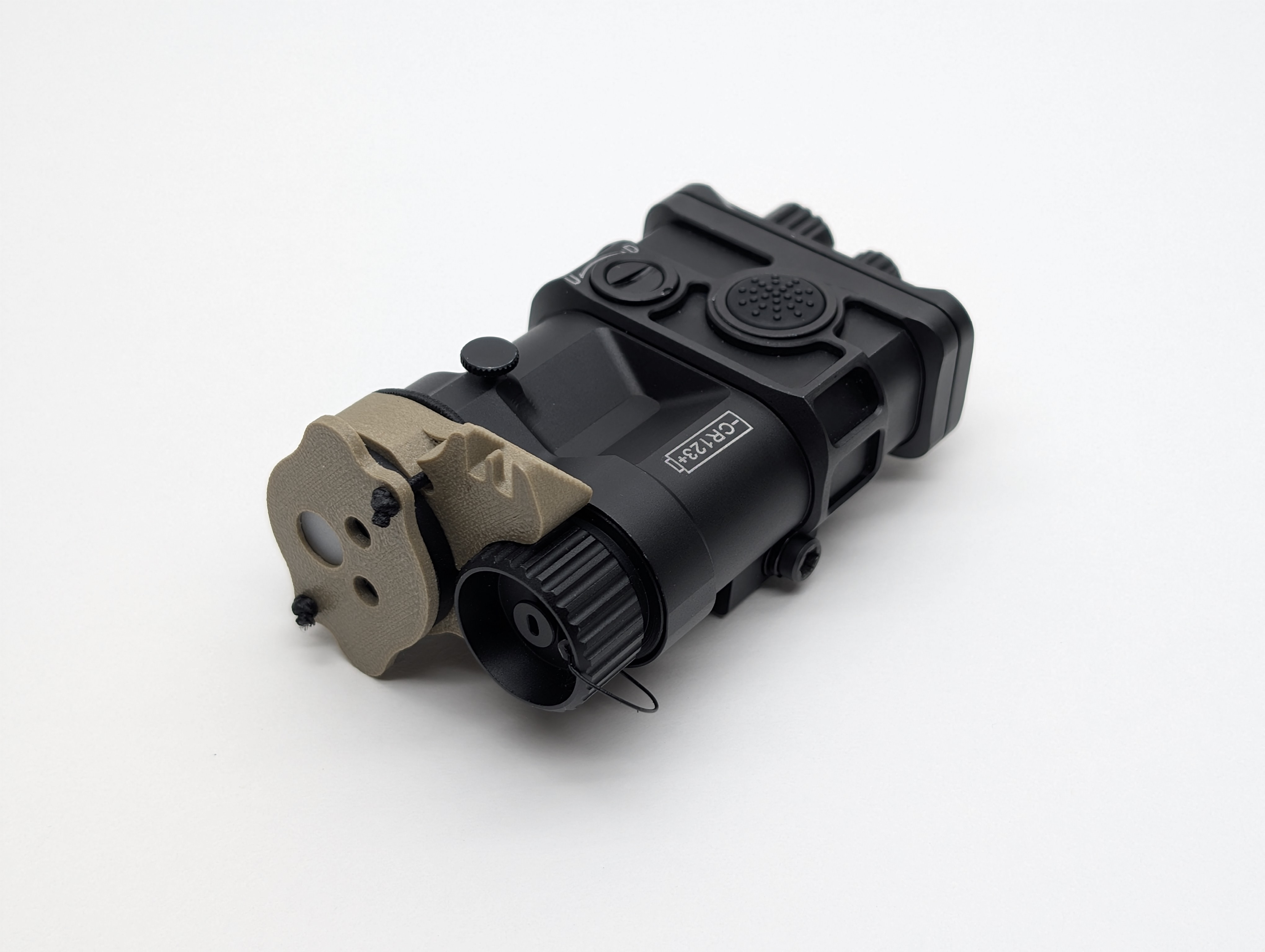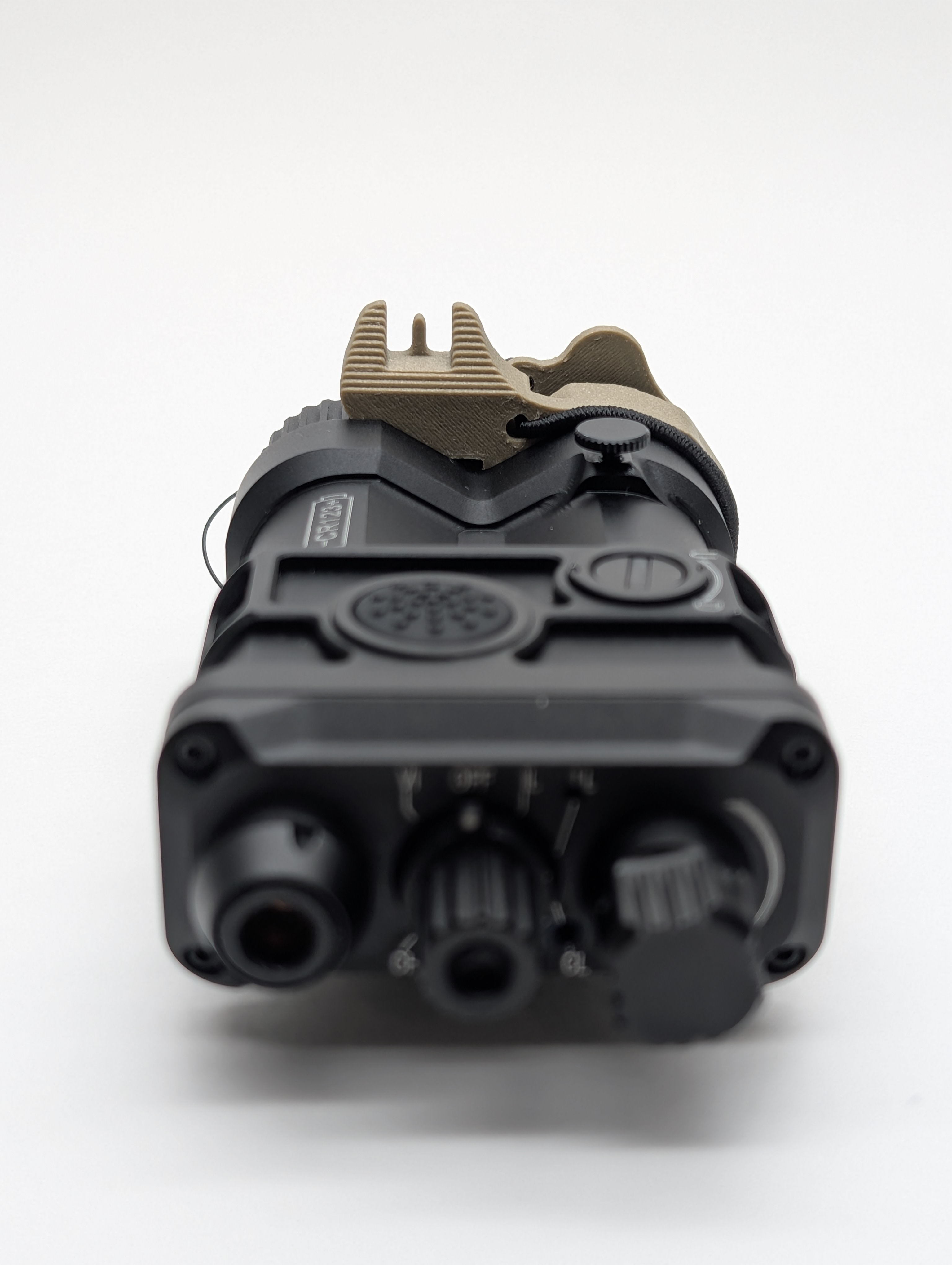 Additionally, this device includes an IR Illuminator diffusion cap. The diffusion cap increases the usefulness of the IR illuminator in short range and indoor scenarios by spreading out the IR light from a tight spotlight into a broad floodlight. This allows the IR laser to be more easily identifiable, increases field of view by illuminating a wider area, and decreases autogating on your night vision unit. The diffusion cap is designed with a quick deploy mechanism for placing it in front of the illuminator, and has easy to grip tabs for resetting the position.